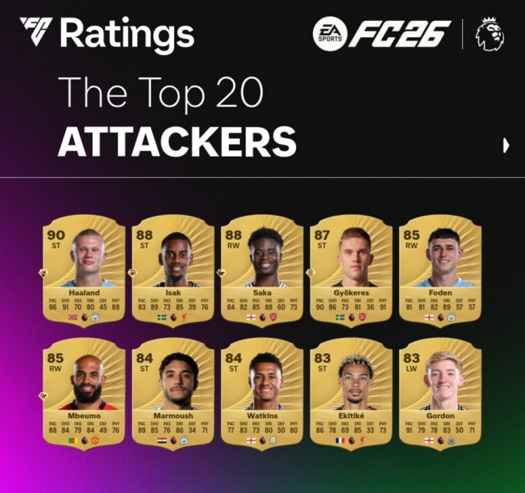 EA Sports于9月9日正式公布了FC26英超攻击手能力值榜单,哈兰德以90分高居榜首,详细排名如下: